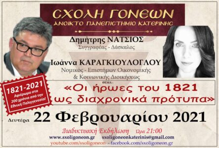 Ο συγγραφέας και μαχητικός δάσκαλος κ. Δημήτρης Νατσιός και η Νομικός – Επιστήμων Οικονομικής & Κοινωνικής Διοικήσεως κ. Ιωάννα Καραγκιούλογλου είναι οι επόμενοι ομιλητές της Σχολής Γονέων – Ανοικτό Πανεπιστήμιο Κατερίνης στο αφιέρωμα της για τα 200 χρόνια απο την Εθνική μας Παλιγγενεσία με θέμα ” Οι ήρωες του 1821 ώς διαχρονικά πρότυπα”.