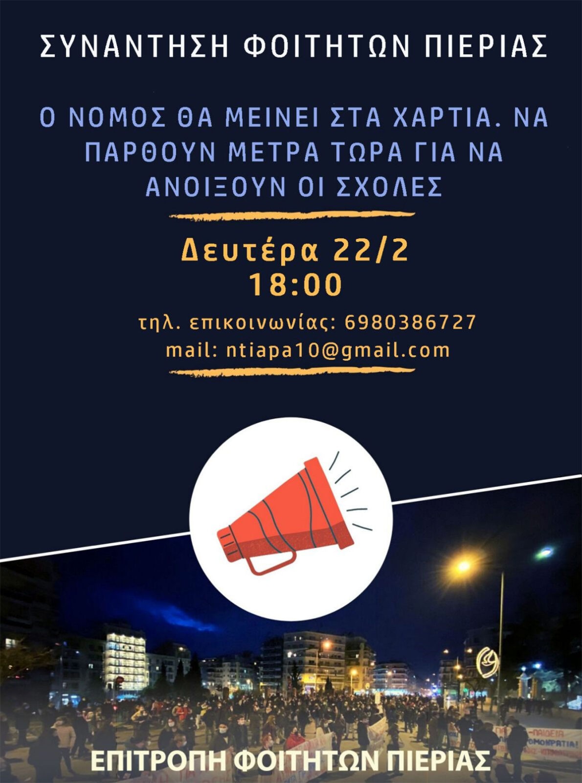 Η Επιτροπή Φοιτητών Πιερίας καλεί σε συνάντηση των φοιτητών στην Κατερίνη τη Δευτέρα 22 Φλεβάρη στις 6 μ.μ. για το συντονισμό των αγωνιστικών πρωτοβουλιών το επόμενο διάστημα.