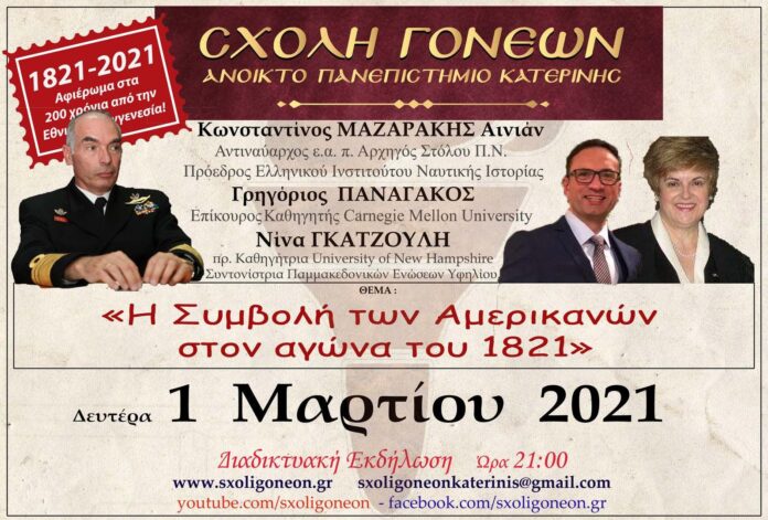Με την συγκεκριμένη εκδήλωση η Σχολή Γονέων – Ανοικτό Πανεπιστήμιο Κατερίνης συνεχίζει το αφιέρωμα των 11 εκδηλώσεων για τα 200 χρόνια από την Εθνική Παλιγγενεσία επιχειρώντας να “φωτίσει” από την πλευρά της Αμερικής την προσφορά των φιλοΑμερικανών στον Εθνικό Αγώνα για την απελευθέρωση της πατρίδας μας από τον Οθωμανικό ζυγό.
