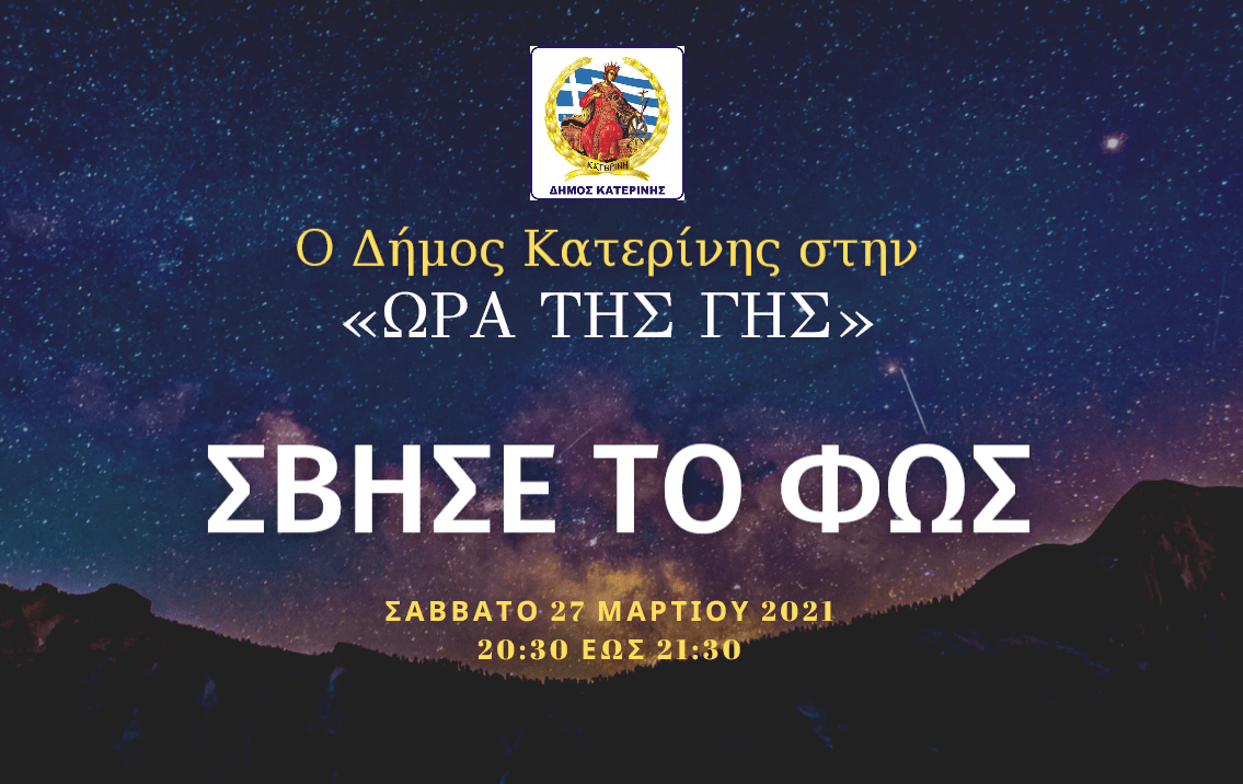 Στην παγκόσμια πρωτοβουλία ευαισθητοποίησης πολιτών, με τίτλο «Η Ώρα της Γης», που αναλαμβάνει και φέτος ο Οργανισμός WWF συμμετέχει ο Δήμος Κατερίνης. Στο πλαίσιο της δράσης αυτής, το Σάββατο 27 Μαρτίου 2021, από τις 20.30 έως τις 21.30 ο Δήμος μας, θα συσκοτίσει συμβολικά τα φώτα στο Δημαρχείο Κατερίνης.