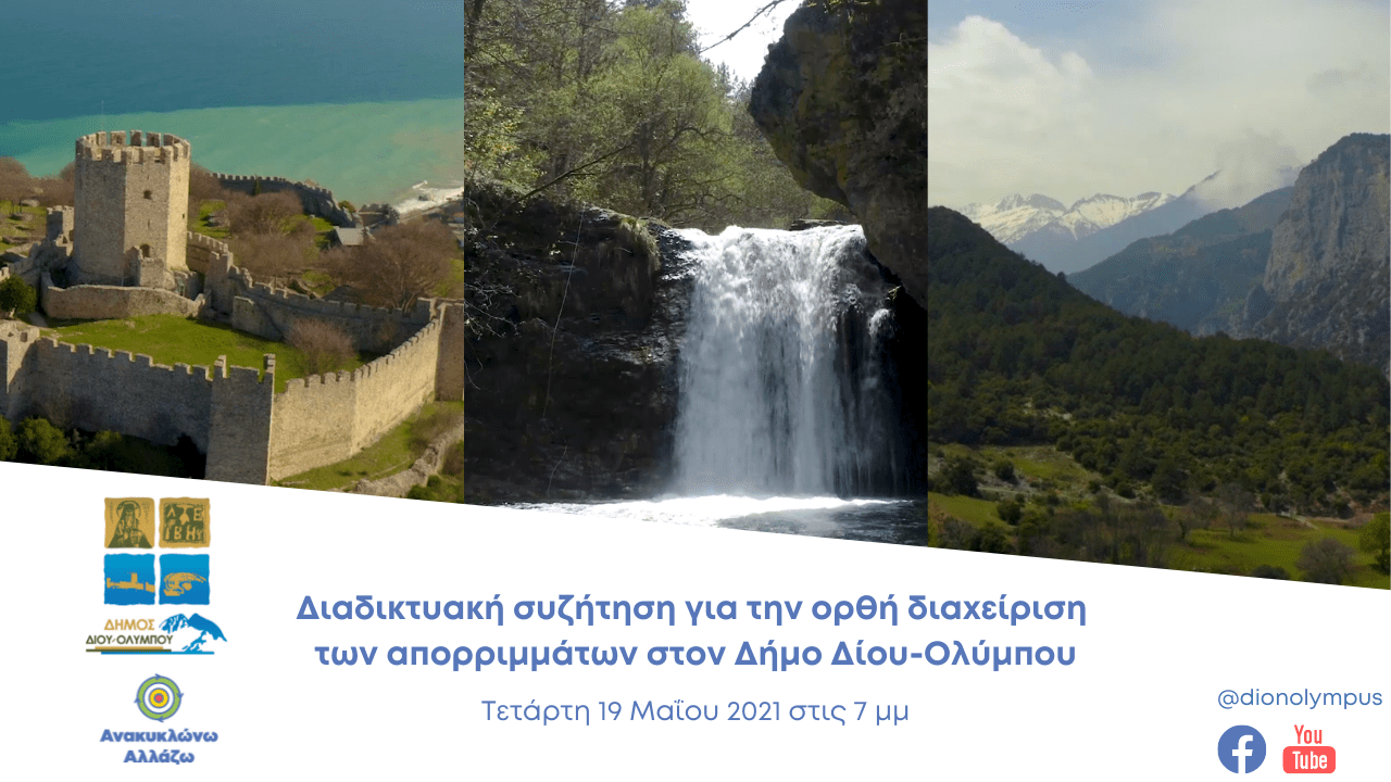 Σας προσκαλούμε να παρακολουθήσετε την Τετάρτη 19 Μαΐου 2021 στις 7 το βράδυ τη διαδικτυακή συζήτηση για την ορθή διαχείριση αποβλήτων και απορριμμάτων στον Δήμο Δίου-Ολύμπου.