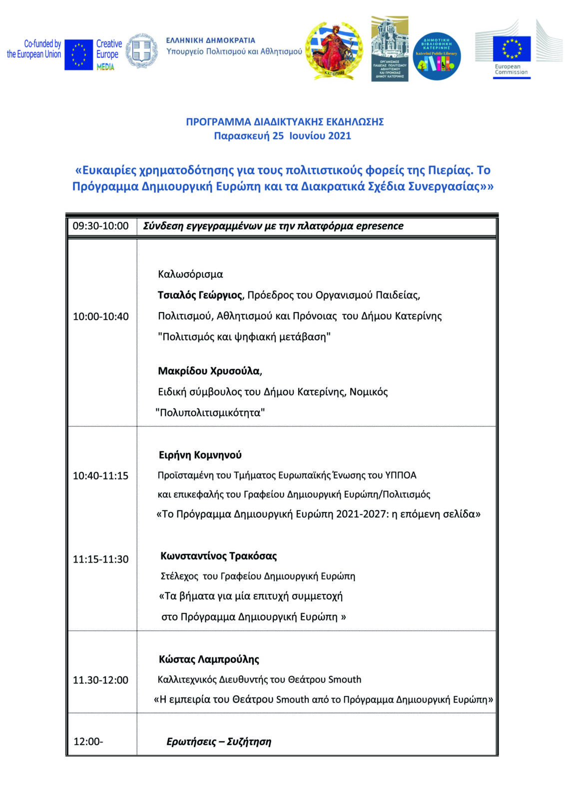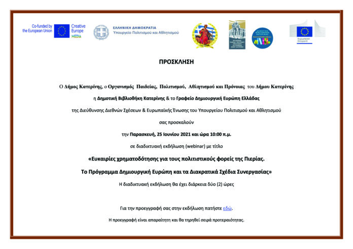 Ο Δήμος Κατερίνης, ο Οργανισμός Παιδείας, Πολιτισμού, Αθλητισμού και Πρόνοιας του Δήμου Κατερίνης και η Δημοτική Βιβλιοθήκη του Δήμου Κατερίνης σε συνεργασία με το Γραφείο Δημιουργική Ευρώπη Ελλάδας, που υπάγεται στο Τμήμα Ευρωπαϊκής Ένωσης της Διεύθυνσης Διεθνών Σχέσεων και Ευρωπαϊκής Ένωσης του Υπουργείου Πολιτισμού και Αθλητισμού, διοργανώνουν την Παρασκευή 25 Ιουνίου 2021, στις 10.00 π.μ. διαδικτυακή εκδήλωση (webinar) με τίτλο: «Ευκαιρίες χρηματοδότησης για τους πολιτιστικούς φορείς της Πιερίας. Το Πρόγραμμα Δημιουργική Ευρώπη και τα Διακρατικά Σχέδια Συνεργασίας».