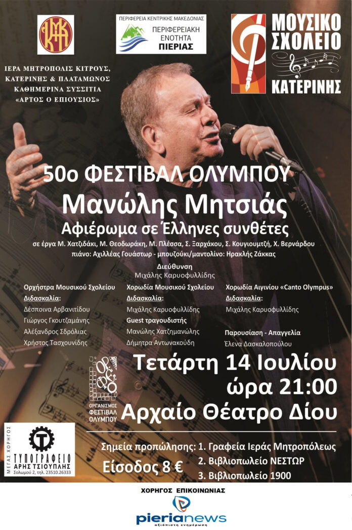 Η Ιερά Μητρόπολη Κίτρους, Κατερίνης και Πλαταμώνος, σε συνεργασία με την Περιφερειακή Ενότητα Πιερίας αλλά και το Μουσικό Σχολείο Κατερίνης, οργανώνουν συναυλία με τον Μανώλη Μητσιά στις 14 Ιουλίου, που θα πραγματοποιηθεί στα πλαίσια του 50ου Φεστιβάλ Ολύμπου.