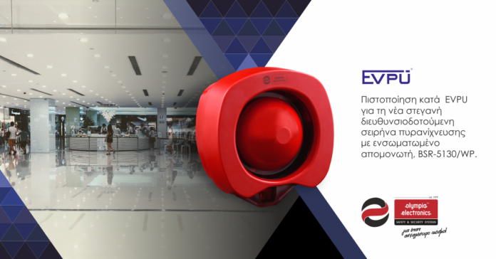 Η OLYMPIA ELECTRONICS A.E. πρόσφατα απέκτησε πιστοποιητικό EVPU για το προϊόν BSR-5130/WP, το οποίο είναι στεγανή διευθυνσιοδοτούμενη σειρήνα πυρανίχνευσης με ενσωματωμένο απομονωτή. Η σειρήνα BSR-5130/WP χρησιμοποιείται ως ηχητικό μέσο σήμανσης σε περίπτωση συναγερμού φωτιάς. Η δυνατή ένταση του ήχου 101dB/1m είναι επαρκής για την μέγιστη κάλυψη του χώρου όπως απαιτείται. Μπορεί να συνεργαστεί με οποιοδήποτε πίνακα πυρανίχνευσης που υποστηρίζει το πρωτόκολλο επικοινωνίας Olympia A Protocol.