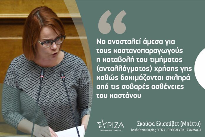 Το ζήτημα του τιμήματος χρήσης γης για τις καστανοκαλιέργειες της Πιερίας αλλά και της υπόλοιπης χώρας, όπως και τα ειδοποιητήρια άμεσης πληρωμής που απεστάλησαν από τις κατά τόπους Διευθύνσεις Δασών, κατ εντολή της κυβέρνησης στους καστανοπαραγωγούς, οι οποίοι πλήττονται ιδιαίτερα οικονομικά τα τελευταία χρόνια λόγω των ασθενειών του καστάνου, φέρνει για συζήτηση στη βουλή με επίκαιρη ερώτηση που κατέθεσε στις 20/9 η βουλεύτρια Πιερίας ΣΥΡΙΖΑ- ΠΣ Ελισσάβετ (Μπέττυ) Σκούφα. Μάλιστα, όπως η ίδια τονίζει, ο υπουργός Περιβάλλοντος κι Ενέργειας, δεν έλαβε υπόψη την ηλεκτρονική επιστολή που απεστάλη προς το Υπουργείο και με θέμα της την αναγκαία θέση σε αναδρομική ισχύ της πρόσφατα εκδοθείσας ΚΥΑ.