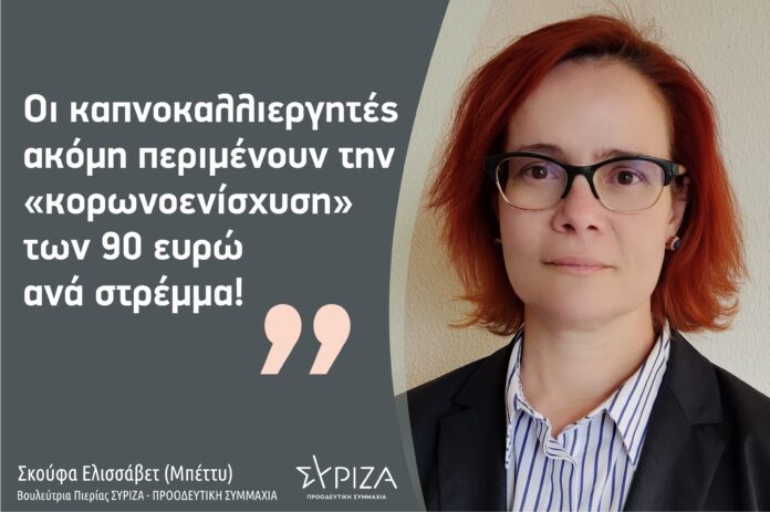 Την επιτακτική ανάγκη στήριξης των καπνοπαραγωγών για τις ζημιές που υπέστησαν λόγω της πανδημίας, επισημαίνει με ερώτηση στους υπουργούς Οικονομικών και Αγροτικής Ανάπτυξης, η βουλεύτρια Πιερίας ΣΥΡΙΖΑ – ΠΣ Ελισσάβετ (Μπέττυ) Σκούφα. Όπως σημειώνει η κα Σκούφα, παρά τις κοινοβουλευτικές παρεμβάσεις και ερωτήσεις της Αξιωματικής Αντιπολίτευσης για την στήριξη της καπνοκαλλιέργειας στη χώρα μας, η κυβέρνηση δεν μπήκε καν στον κόπο να ανταποκριθεί, πλην μιας απάντησης σε κοινοβουλευτική ερώτηση, απάντηση όμως με καθαρά φορμαλιστικό χαρακτήρα κι ωραίο λεξιλόγιο, δίχως ουσία και ξεκάθαρες προθέσεις για το τι πραγματικά προτίθεται να πράξει.