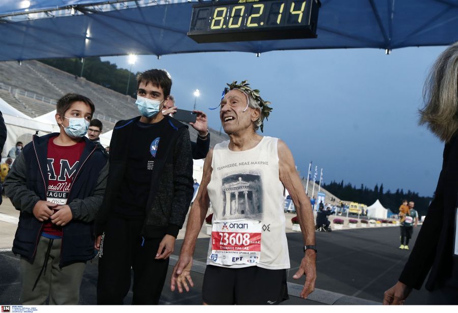 Ο κ. Στέλιος τα κατάφερε τελικά. Στον τερματισμό τον αγκάλιασαν τα εγγόνια του, ενώ η πρόεδρος του ΣΕΓΑΣ Σοφία Σακοράφα του φόρεσε ένα στεφάνι από κλαδιά ελιάς στο κεφάλι.
