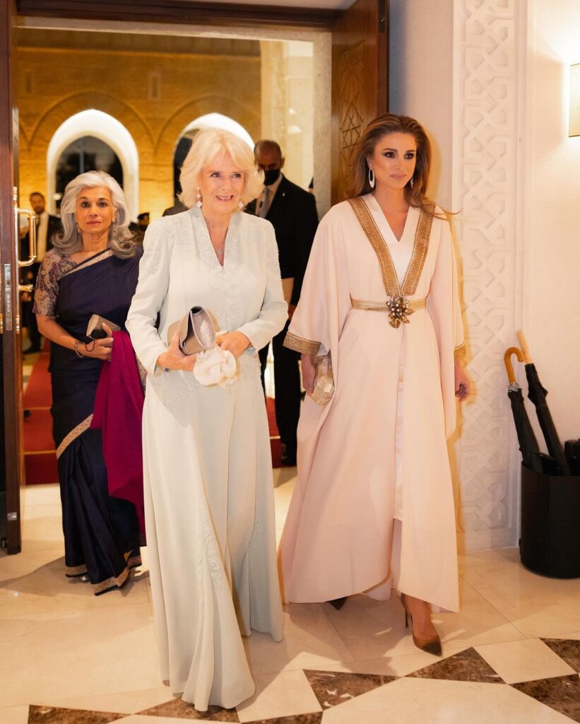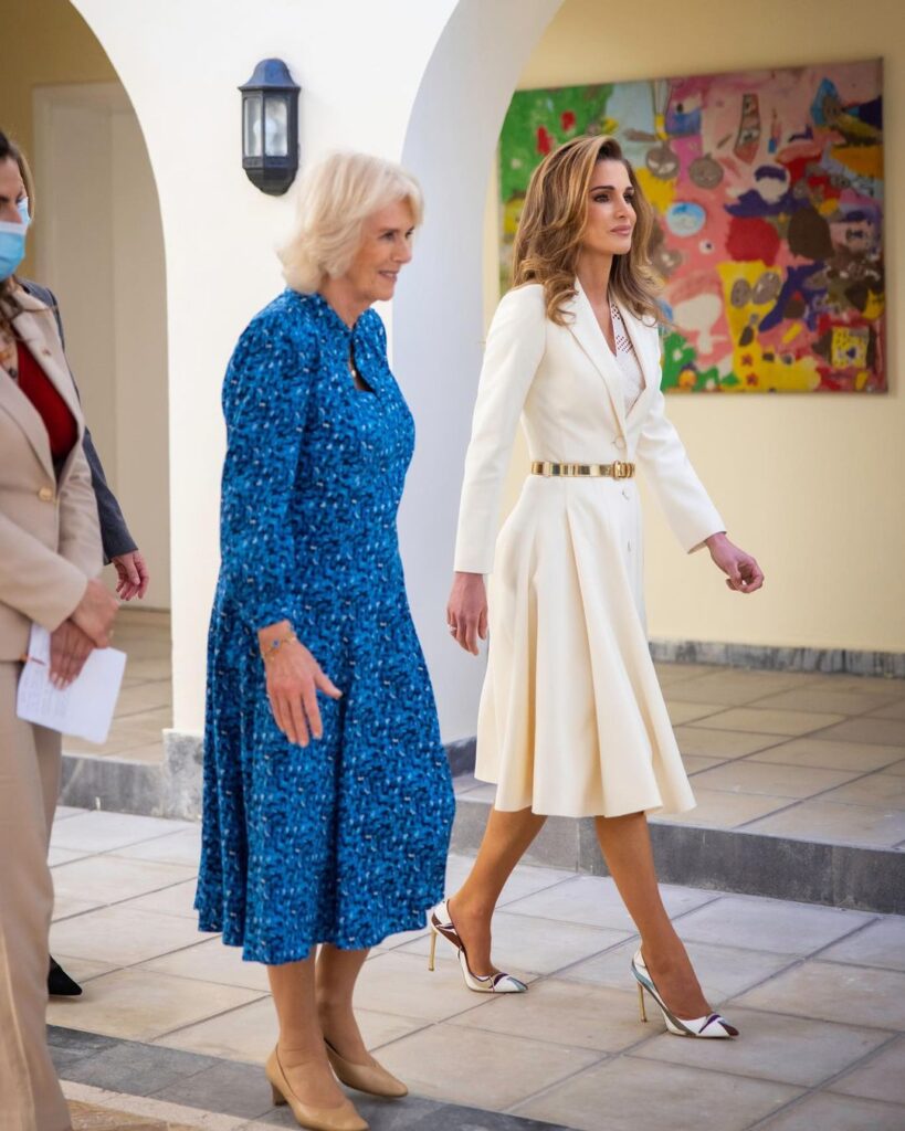 Η Καμίλα επέλεξε για τη συνάντησή της με τη Ράνια ένα μπλε midi φόρεμα που συνδύασε με nude γόβες, ενώ η Ράνια εντυπωσίασε για ακόμα μια φορά με το στιλ επιλέγοντας ένα λευκό σύνολο, ένα λευκό φόρεμα που είχε συνδυάσει με μια χρυσή ζώνη.