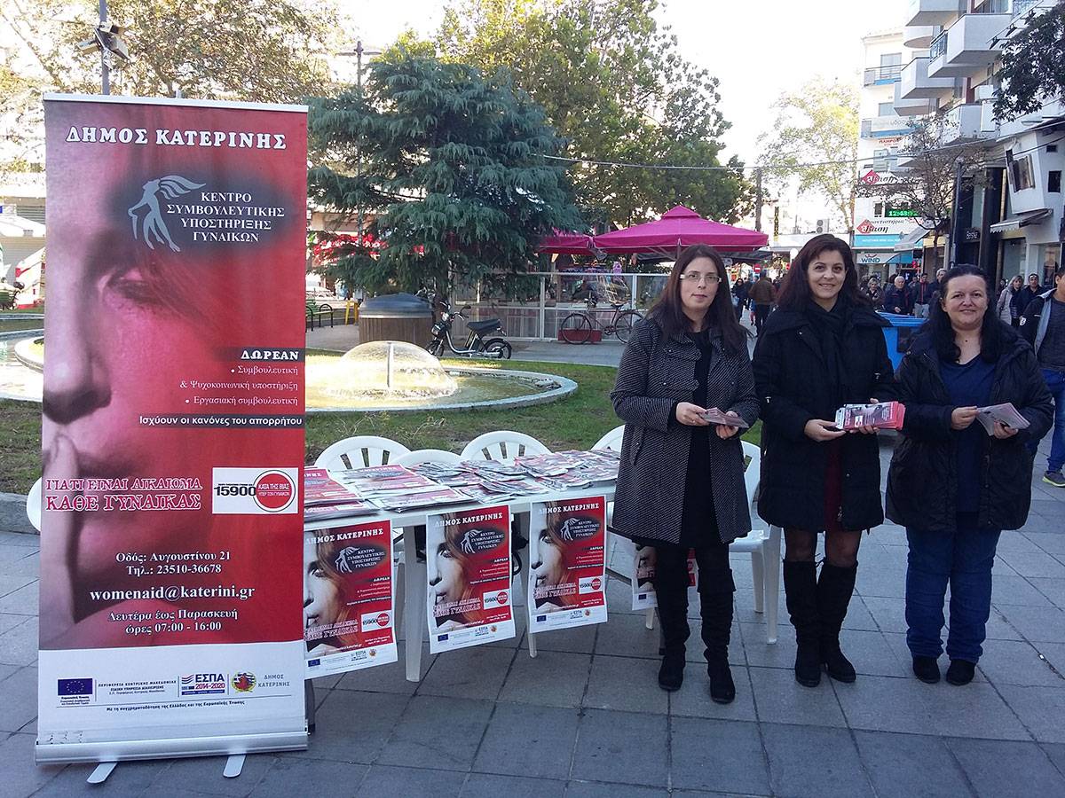Με αφορμή την Παγκόσμια Ημέρα για την Εξάλειψη της βίας κατά των Γυναικών, το Κέντρο Συμβουλευτικής Υποστήριξης Γυναικών Δήμου Κατερίνης, στο πλαίσιο συνεχούς ενημέρωσης και ευαισθητοποίησης της τοπικής κοινωνίας, θα πραγματοποιήσει τις εξής δράσεις: