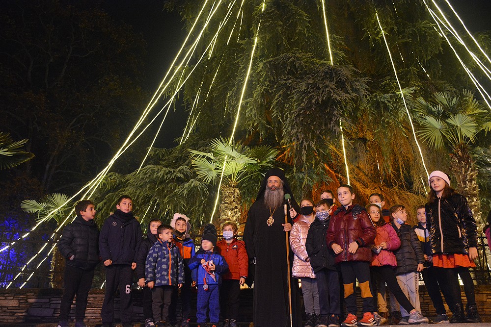 Το βράδυ της Τετάρτης 24 Νοεμβρίου, μετά τον Πανηγυρικό Αρχιερατικό Εσπερινό της Πολιούχου Αγίας Αικατερίνης, πραγματοποιήθηκε η φωταγώγηση του φυσικού κέδρου και της φάτνης που βρίσκονται στην αυλή του Μητροπολιτικού Μεγάρου Κατερίνης.