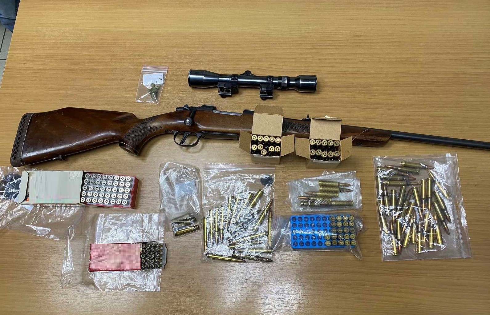 Σε έρευνα που ακολούθησε στην οικία του βρέθηκαν και κατασχέθηκαν 1 πολεμικό τυφέκιο, 1 σκοπευτική διόπτρα, 135 φυσίγγια διαφόρων διαμετρημάτων και 23 αβολίδωτα φυσίγγια.