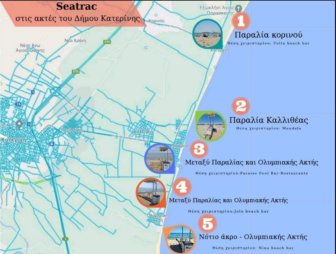 - Τοποθετήθηκαν τους καλοκαιρινούς μήνες πέντε SEATRACK στην θαλάσσια ακτογραμμή του Δήμου Κατερίνης. Με τη συμμετοχή 60 και πλέον εθελοντών καλύφθηκαν όλες οι βάρδιες καθ΄ όλη τη διάρκεια του καλοκαιριού.