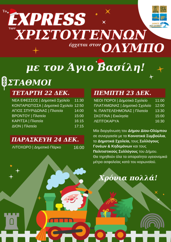 Ο Δήμος Δίου-Ολύμπου σας προσκαλεί σε μία χριστουγεννιάτικη βόλτα με το Express των Χριστουγέννων, το οποίο φέτος κάνει στάση στον Όλυμπο!