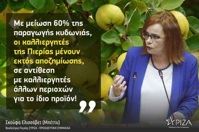 Τις ζημιές που υπέστησαν οι καλλιεργητές κυδωνιάς στην Πιερία, από τον παγετό στις 9 Απριλίου 2021, φέρνει στη Βουλή με Αναφορά που κατέθεσε η Βουλεύτρια Πιερίας ΣΥΡΙΖΑ- ΠΣ Ελισσάβετ (Μπέττυ) Σκούφα, με αφορμή την επιστολή του προέδρου του Αγροτικού Συνεταιρισμού Κονταριώτισσας Ηλία Γκρίνια. Η επιστολή συνοδεύεται από συγκεντρωτικό πίνακα των δελτίων παραλαβής, από τον οποίο προκύπτει ότι το 2021 παραδόθηκαν από τους καλλιεργητές Πιερίας στους συνεργαζόμενους εμπόρους συνολικά 319 τόνοι κυδωνιάς από τα 197 καλλιεργημένα στρέμματα, το οποία υπό φυσιολογικές συνθήκες θα έπρεπε να αποδώσουν 4.000 κιλά ανά στρέμμα, δηλαδή 788 τόνους συνολικά, εμπορεύσιμης παραγωγής.