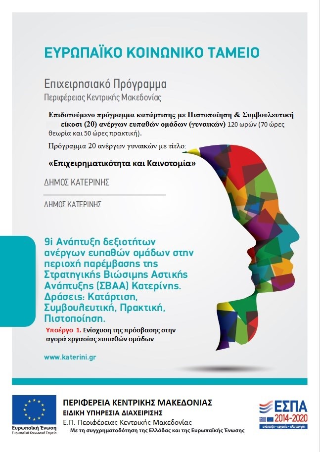 ΠΡΑΞΗ: «Ανάπτυξη δεξιοτήτων ανέργων ευπαθών ομάδων στην περιοχή παρέμβασης της Στρατηγικής Βιώσιμης Αστικής Ανάπτυξης (ΣΒΑΑ) Κατερίνης» Κωδικός ΟΠΣ 5067557.