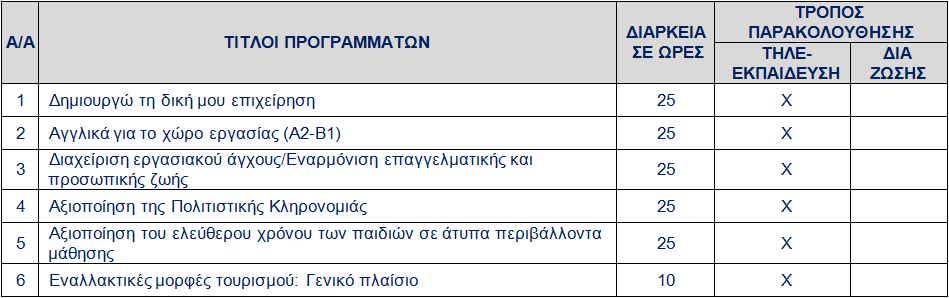 Σε περίπτωση αναστολής της δια ζώσης εκπαίδευσης λόγω περιοριστικών μέτρων για την αντιμετώπιση της πανδημίας της νόσου Covid-19, τα τμήματα μάθησης θα υλοποιούνται μόνο μέσω τηλε-εκπαίδευσης (εξ αποστάσεως παρακολούθηση).