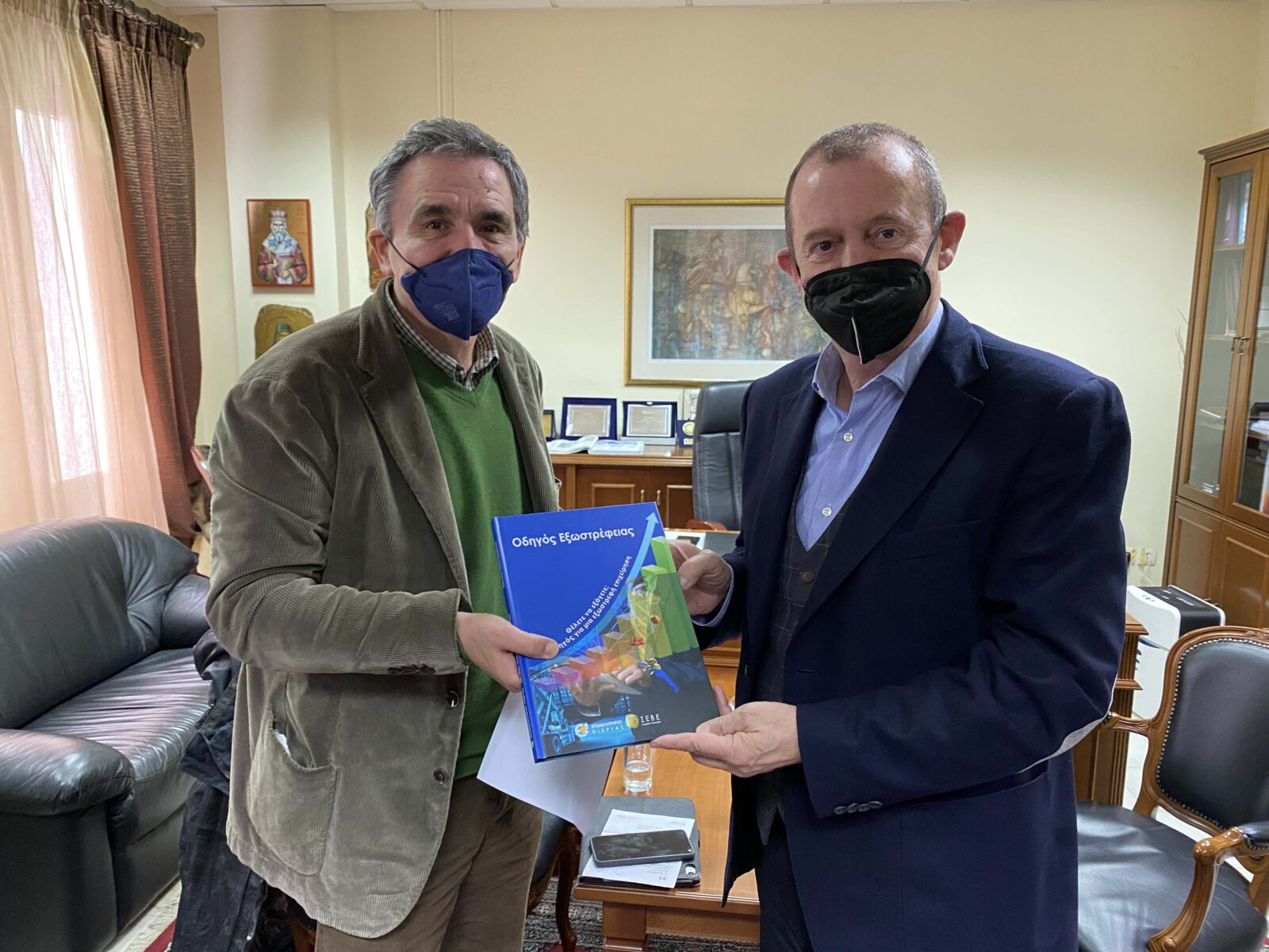 Στο τέλος της συνάντησης ο κ. Χατζηχριστοδούλου προσέφερε στον κ. Τσακαλώτο τον Οδηγό Εξωστρέφειας των Επιχειρήσεων.