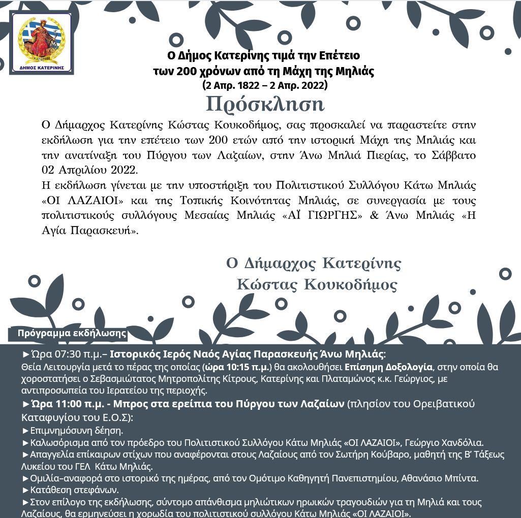 Το Σάββατο 02 Απριλίου 2022 εκδήλωση, για την επέτειο των 200 ετών από την ιστορική Μάχη της Μηλιάς και την ανατίναξη του Πύργου των Λαζαίων, θα πραγματοποιηθεί από τον Δήμο Κατερίνης, με την υποστήριξη του Πολιτιστικού Συλλόγου Κάτω Μηλιάς «ΟΙ ΛΑΖΑΙΟΙ» και της Τοπικής Κοινότητας Μηλιάς, σε συνεργασία με τους πολιτιστικούς συλλόγους Μεσαίας Μηλιάς «ΑΪ ΓΙΩΡΓΗΣ» & Άνω Μηλιάς «Η Αγία Παρασκευή».
