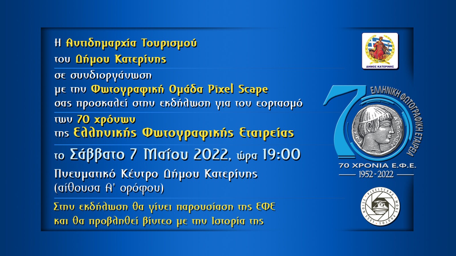 Τα 70 χρόνια από την ίδρυσή της, γιορτάζει στην Κατερίνη η Ελληνική Φωτογραφική Εταιρεία, διοργανώνοντας σε συνεργασία με την Αντιδημαρχία Τουρισμού και τη φωτογραφική ομάδα Pixelscape, ανοιχτή εκδήλωση, το Σάββατο 7 Μαϊου (ώρα 19:00) στο Συνεδριακό Κέντρο Κατερίνης (1ος όροφος)