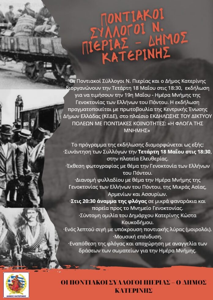 Οι Ποντιακοί Σύλλογοι Ν. Πιερίας και ο Δήμος Κατερίνης διοργανώνουν την Τετάρτη 18 Μαΐου στις 18:30, εκδήλωση για να τιμήσουν την 19η Μαΐου – Ημέρα Μνήμης της Γενοκτονίας των Ελλήνων του Πόντου. Η εκδήλωση πραγματοποιείται με πρωτοβουλία της Κεντρικής Ένωσης Δήμων Ελλάδας (ΚΕΔΕ), στο πλαίσιο ΕΚΔΗΛΩΣΗΣ ΤΟΥ ΔΙΚΤΥΟΥ ΠΟΛΕΩΝ ΜΕ ΠΟΝΤΙΑΚΕΣ ΚΟΙΝΟΤΗΤΕΣ: «Η ΦΛΟΓΑ ΤΗΣ ΜΝΗΜΗΣ»