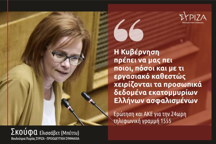 Μια σειρά ερωτημάτων ως προς το εργασιακό καθεστώς των υπαλλήλων που εργάζονται στην 24ωρη δωρεάν τηλεφωνική γραμμή εξυπηρέτησης πολιτών 1555, που παρέχει πληροφορίες για εργασιακά, ασφαλιστικά, συνταξιοδοτικά και άλλα θέματα, αλλά και ερωτήματα για τη διασφάλιση των προσωπικών δεδομένων των ασφαλισμένων, τίθενται στην Ερώτηση και Αίτηση Κατάθεσης Εγγράφων, που κατέθεσε η βουλεύτρια Πιερίας ΣΥΡΙΖΑ – ΠΣ Ελισσάβετ (Μπέττυ) Σκούφα. Την ερώτηση συνυπογράφουν 41 ακόμη βουλευτές της Αξιωματικής Αντιπολίτευσης.