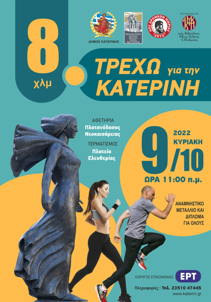 O Δήμος Κατερίνης – Οργανισμός Παιδείας, Πολιτισμού, Αθλητισμού & Πρόνοιας (Ο.Π.Π.Α.Π.) και ο Αθλητικός Πολιτιστικός Σύλλογος Δρομέων Πιερίας «ΖΕΥΣ» διοργανώνουν και προκηρύσσουν τον 9ο Αγώνα Δρόμου 8 χιλιομέτρων, με την επωνυμία «ΤΡΕΧΩ ΓΙΑ ΤΗΝ ΚΑΤΕΡΙΝΗ». Ο αγώνας τελεί υπό την αιγίδα της Ιεράς Μητροπόλεως Κίτρους, Κατερίνης & Πλαταμώνος.