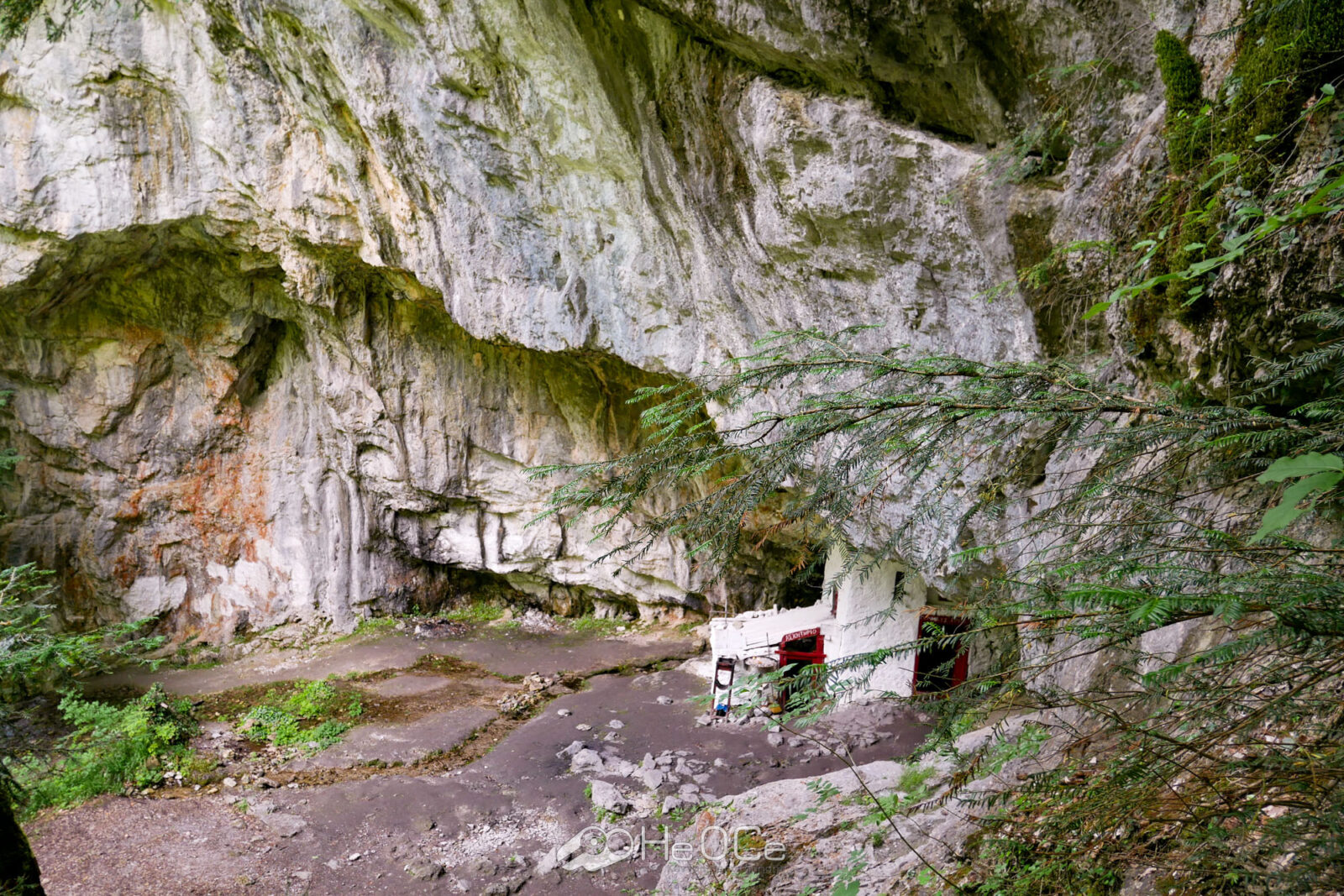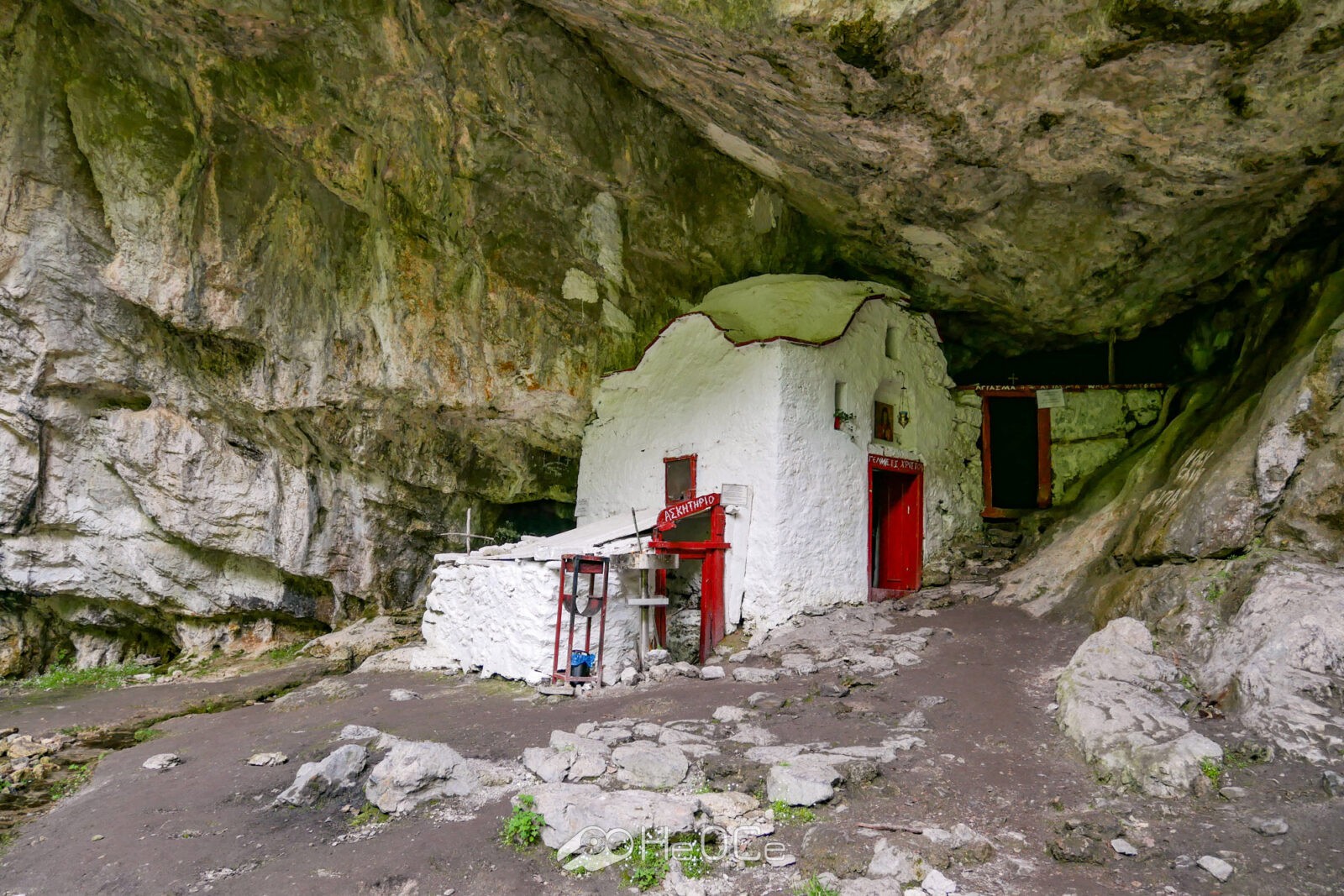 Το μονοπάτι πλέον έχει ανηφορική πορεία και κινούμαστε ψηλότερα και παράλληλα με την κοίτη του Ενιπέα. Μετά από πορεία 20 λεπτών περίπου έχουμε φτάσει στο σημείο οπού μπορούμε να αντικρίσουμε το εντυπωσιακό Άγιο σπήλαιο, το σπήλαιο στο οποίο ασκήτεψε ο Άγιος Διονύσιος.