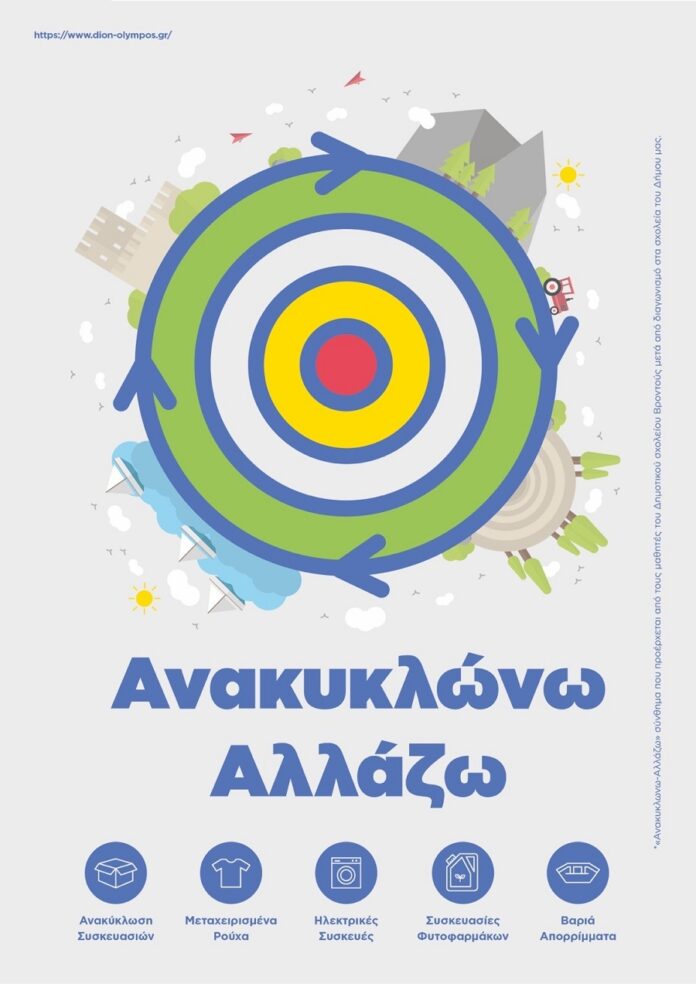 Στον ακόλουθο σύνδεσμο μπορείτε να δείτε τα σημεία όπου βρίσκονται κάδοι ανακύκλωσης στις 12 κοινότητες του Δήμου: https://www.dion-olympos.gr/anakyklosi-xartis/