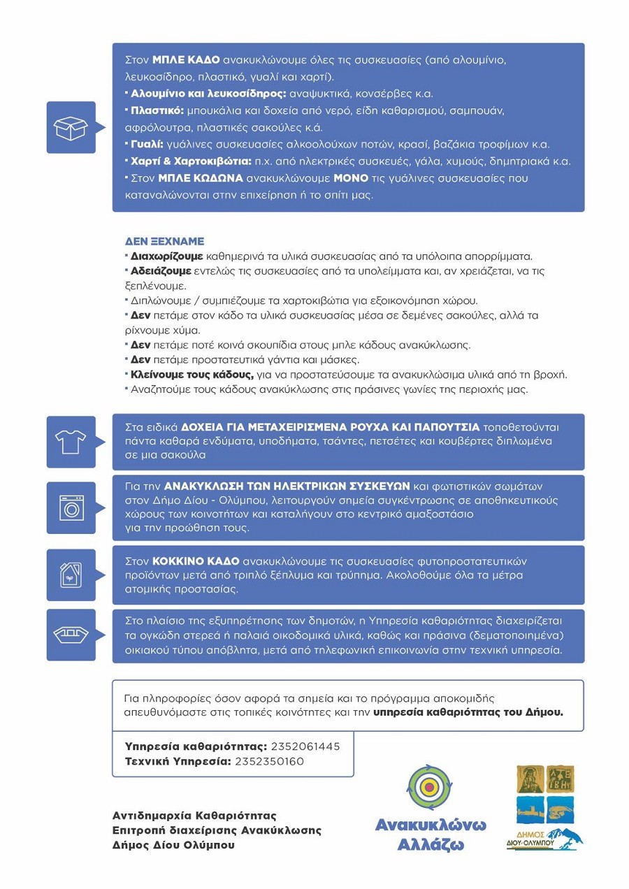 Για το λόγο αυτό, η Αντιδημαρχία Καθαριότητας του Δήμου Δίου-Ολύμπου υπενθυμίζει στους πολίτες ότι στις «γωνιές ανακύκλωσης» του Δήμου βρίσκονται: