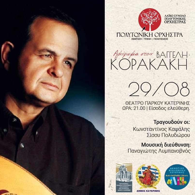 Το γνώριμο και ιδιαίτερο λαϊκό ύφος του Βαγγέλη Κορακάκη φέρνει στο προσκήνιο, η συναυλία – αφιέρωμα της Πολυτονικής Ορχήστρας Κατερίνης στον αυθεντικό συνθέτη και στιχουργό.