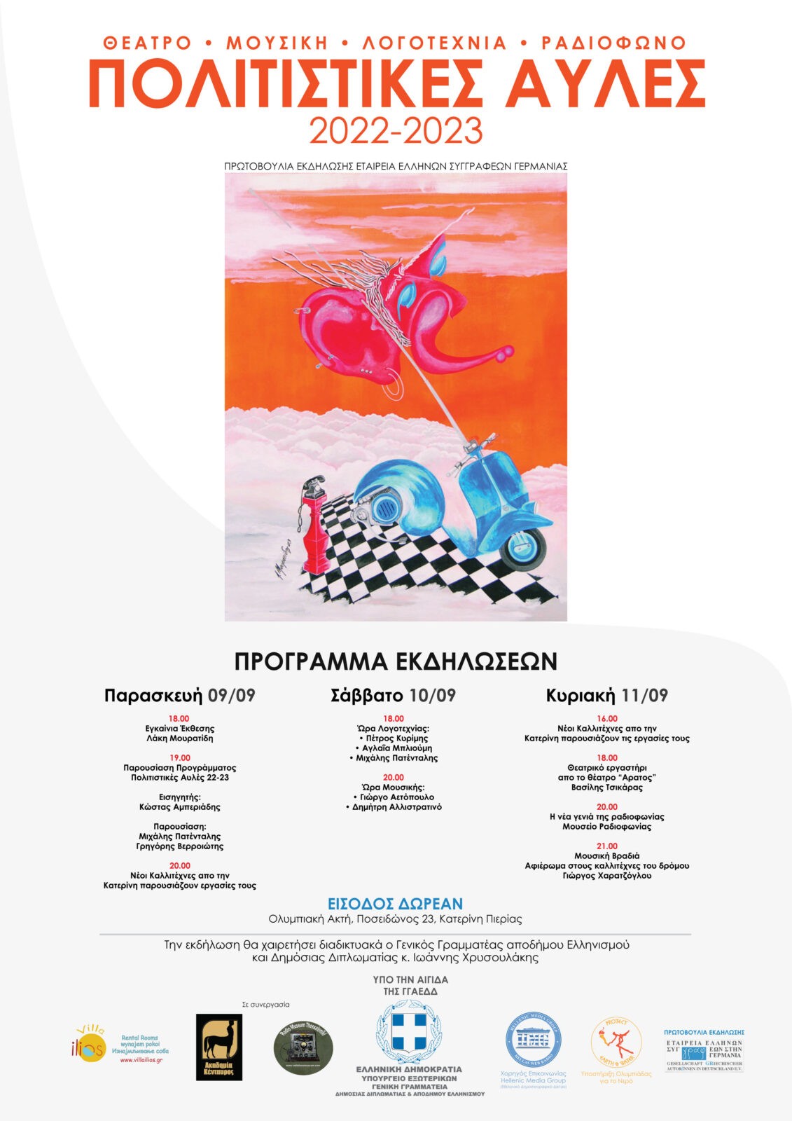 Σας καλούμε λοιπόν να μάθετε περισσότερα για το σχεδιασμό και στόχους των Πολιτιστικών Αυλών 2022 – 23 στις 9-10 και 11 Σεπτεμβρίου στην τριήμερη εκδήλωση που θα πραγματοποιηθεί στην Ελλάδα και συγκεκριμένα στη Ολυμπιακή Ακτή Κατερίνης – Πιερία στη Villa Ilios, σε μια δράση παράδειγμα για το πόσο χρήσιμο και ωφέλιμο είναι ακόμη και σε ένα μικρό προαύλιο χώρο, να πραγματοποιούμε μικρές και μεγάλες πολλές εκδηλώσεις πολιτισμού όλο το χρόνο.