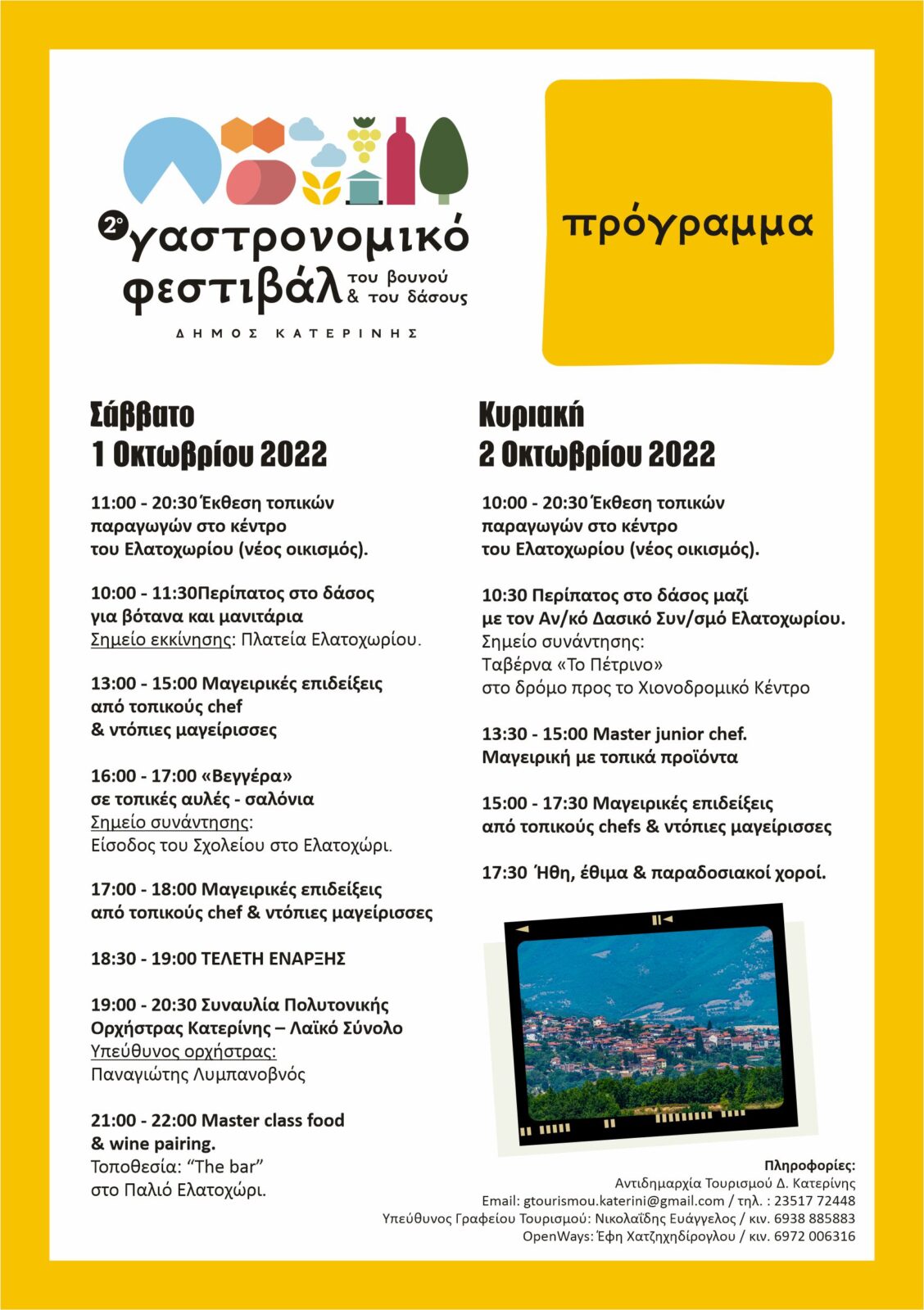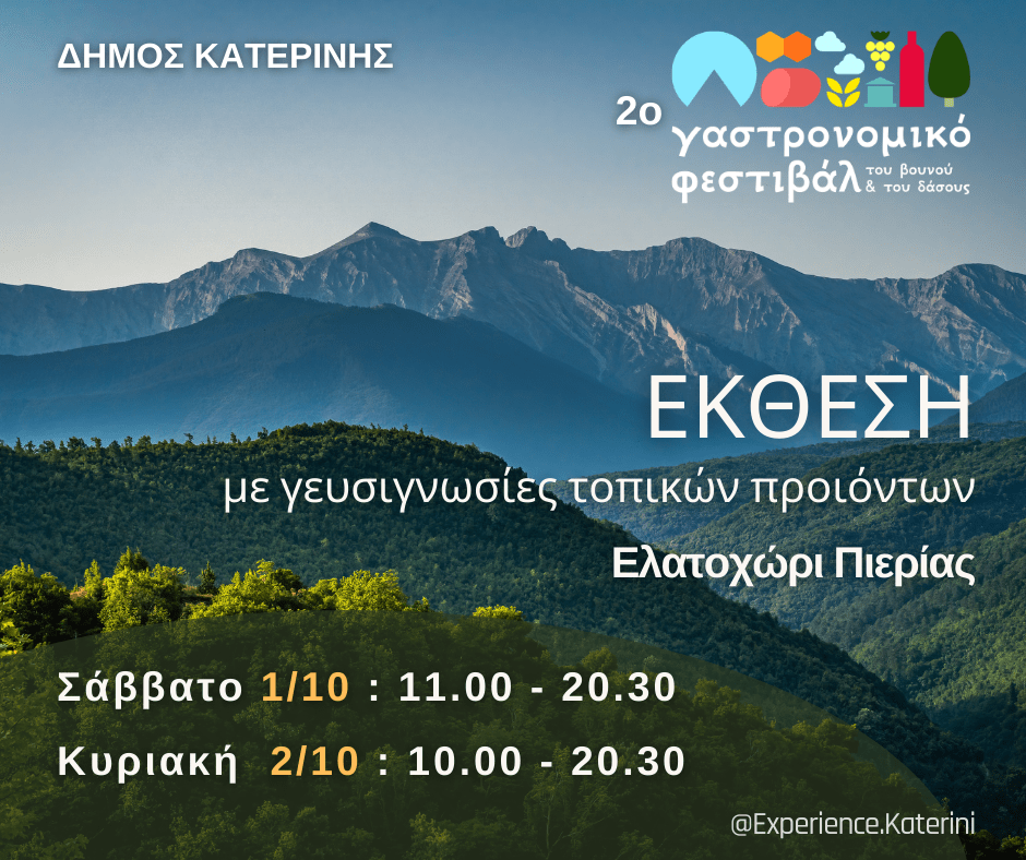 Μετά από το επιτυχημένο 1ο Γαστρονομικό Φεστιβάλ του βουνού και του δάσους, τον Ιούνη του 2022 στον Άγιο Δημήτριο Πιερίας, η Αντιδημαρχία Τουρισμού Δ. Κατερίνης διοργανώνει σε συνεργασία με την ΔΕΕΕΚ/Δημοτικό Ραδιόφωνο Κατερίνης 95.3FM, τον ΟΠΠΑΠ Δ. Κατερίνης και τοπικούς φορείς του Ελατοχωρίου, το 2ο Γαστρονομικό Φεστιβάλ του βουνού και του δάσους με έδρα το πανέμορφο Ελατοχώρι.