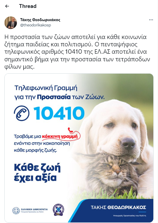 «Η προστασία των ζώων αποτελεί για κάθε κοινωνία ζήτημα παιδείας και πολιτισμού. Δίνουμε αξία σε κάθε ζωή. Ο πενταψήφιος τηλεφωνικός αριθμός 10410 της ΕΛ.ΑΣ αποτελεί ένα σημαντικό βήμα για την προστασία των τετράποδων φίλων μας. Θέτουμε από σήμερα ένα χρήσιμο εργαλείο στην υπηρεσία των πολιτών, εξελίσσοντας τις υπηρεσίες της Αστυνομίας μας. Όλοι μαζί εκπέμπουμε ένα ισχυρό μήνυμα ενάντια στην κακοποίηση κάθε μορφής ζωής».