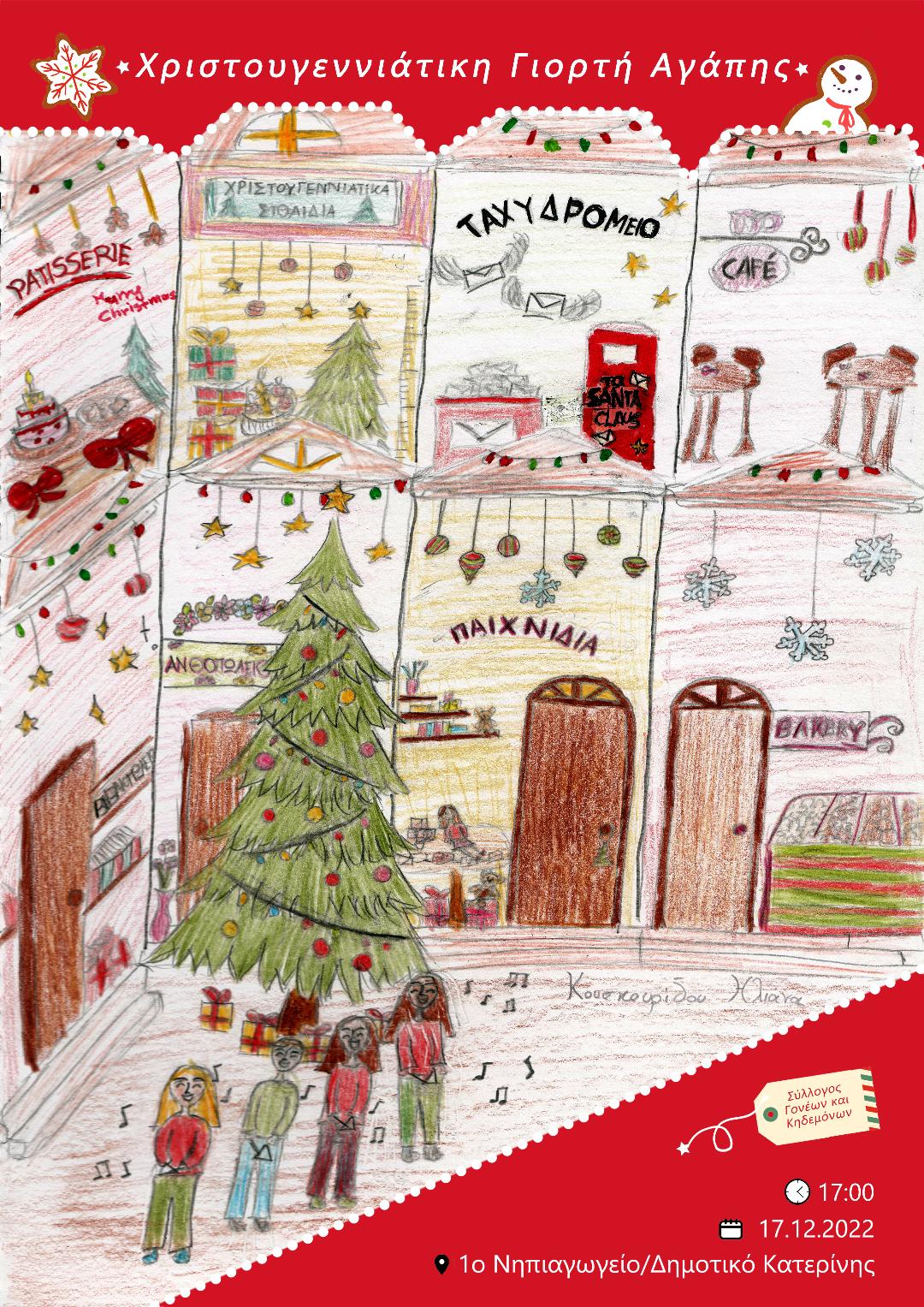 Μετά από 2 χρόνια απουσίας ο Σύλλογος Γονέων και Κηδεμόνων του 1ου Δημοτικού και Νηπιαγωγείου Κατερίνης σας προσκαλεί στην χριστουγεννιάτικη γιορτή αγάπης  που διοργανώνει το Σάββατο 17 Δεκεμβρίου, στις 5:00μ.μ. στον χώρο του σχολείου.