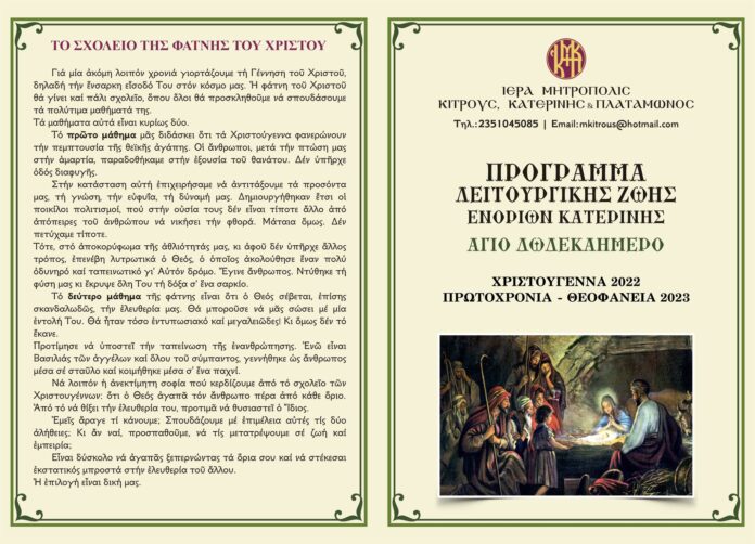 Έχει καταρτισθεί και κυκλοφορεί σε καλαίσθητο έντυπο το αναλυτικό πρόγραμμα τελέσεως των Μεγάλων Ωρών, των Θ. Λειτουργιών Χριστουγέννων, Πρωτοχρονιάς και Θεοφανείων, των ειδικών Αγρυπνιών και τελετών, σε ειδικό ωράριο, εκτός αυτών που ήδη τελούνται σε κάθε Ενορία.