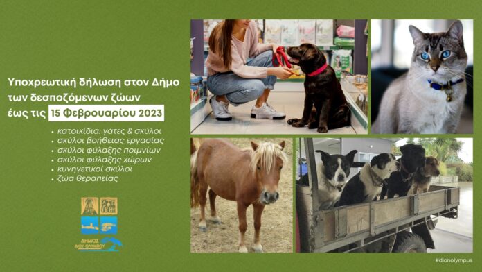 Ο Δήμος Δίου-Ολύμπου καλεί του δημότες που είναι ιδιοκτήτες δεσποζόμενων ζώων συντροφιάς να προσέλθουν στα Δημαρχεία Κονταριώτισσας, Λεπτοκαρυάς και Λιτοχώρου προκειμένου να δηλώσουν τα δεσποζόμενα ζώα που έχουν στην κατοχή τους, μέχρι τις 15 Φεβρουαρίου 2023.