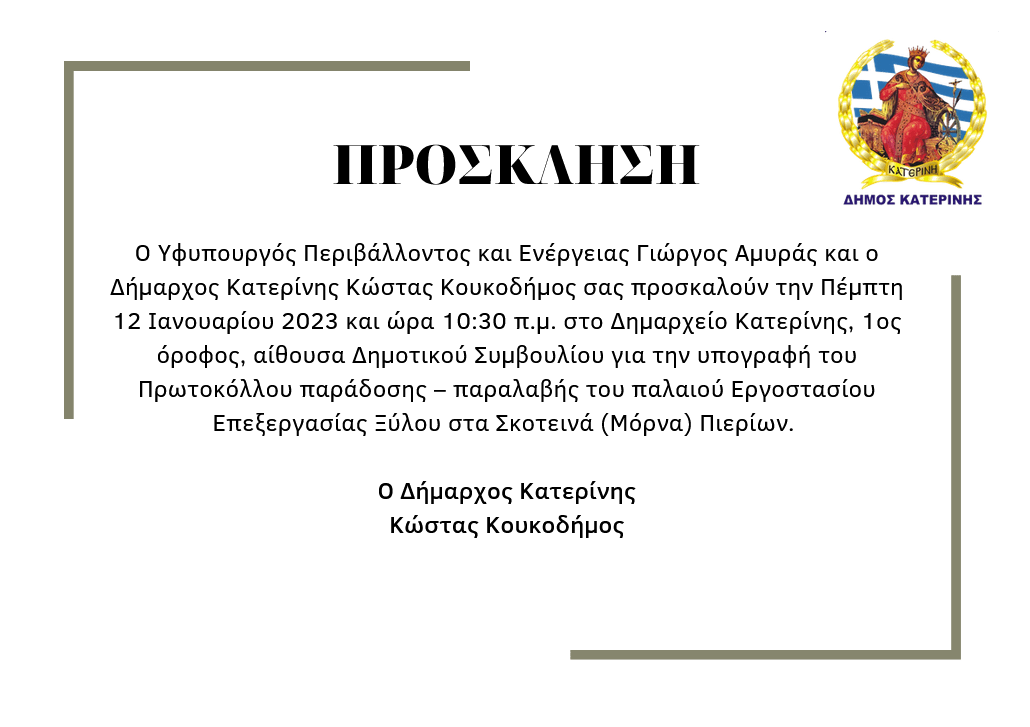 Το σχετικό πρωτόκολλο παράδοσης – παραλαβής, θα υπογραφεί την Πέμπτη 12 Ιανουαρίου 2023 και ώρα 10:30 π.μ. στο Δημαρχείο Κατερίνης (1ος όροφος, αίθουσα Δημοτικού Συμβουλίου).