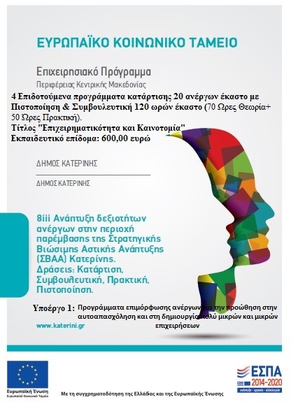 ΠΡΑΞΗ: «Ανάπτυξη δεξιοτήτων ανέργων στην περιοχή παρέμβασης της Στρατηγικής Βιώσιμης Αστικής Ανάπτυξης (ΣΒΑΑ) Κατερίνης» Κωδικός ΟΠΣ 5066578.