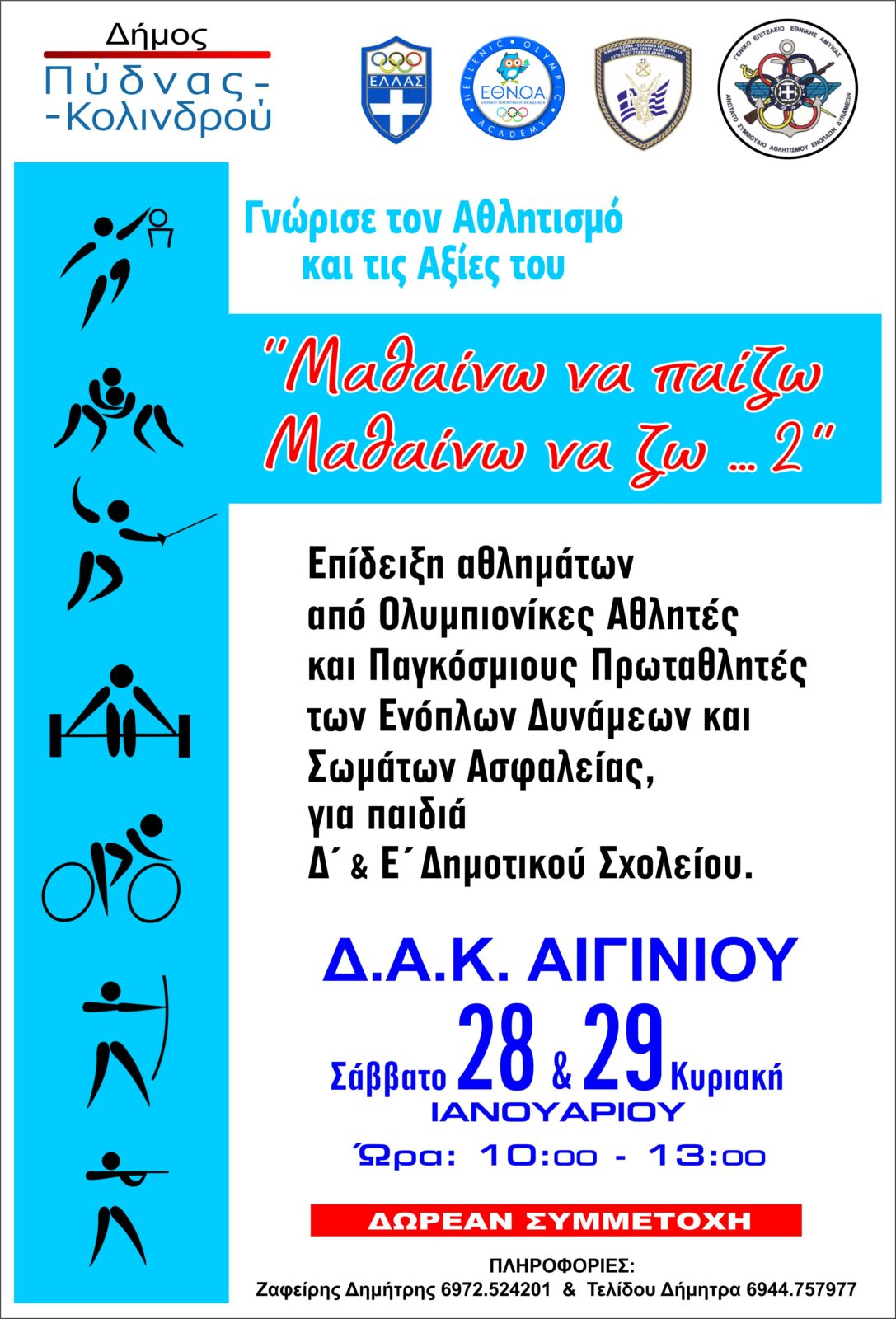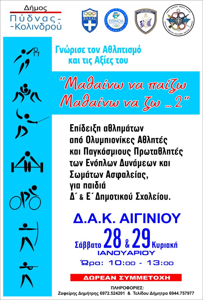 Στο πλαίσιο διοργανώσεως αθλητικών δρωμένων από το δήμο Πύδνας-Κολινδρού, το Σαββατοκύριακο 28-29 Ιανουαρίου 2023 θα πραγματοποιηθεί στο Δ.Α.Κ. Αιγινίου και σε συνεργασία με το ΓΕΕΘΑ/ΑΣΑΕΔ, την ΕΘΝΟΑ, την ΕΟΕ και το Λιμενικό Σώμα-Ελληνικής Ακτοφυλακής, η δραστηριότητα “Μαθαίνω να παίζω – Μαθαίνω να ζω -2”. Ολυμπιονίκες αθλητές και παγκόσμιοι πρωταθλητές των Ενόπλων Δυνάμεων και των Σωμάτων Ασφαλείας, θα πραγματοποιήσουν επιδείξεις αθλημάτων σε μαθητές Δ΄ και Ε΄ Δημοτικού των Σχολείων του δήμου.
