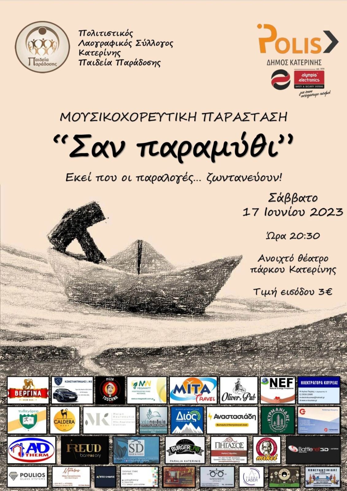 Με μεγάλη επιτυχία το Σάββατο το βράδυ στο γεμάτο απο κόσμο θέατρο του Πάρκου Κατερίνης πραγματοποιήθηκε η μουσικοχορευτική παράσταση με τίτλο “Σαν Παραμύθι” από τον Πολιτιστικό, Λαογραφικό Σύλλογο Κατερίνης Παιδεία Παράδοσης!