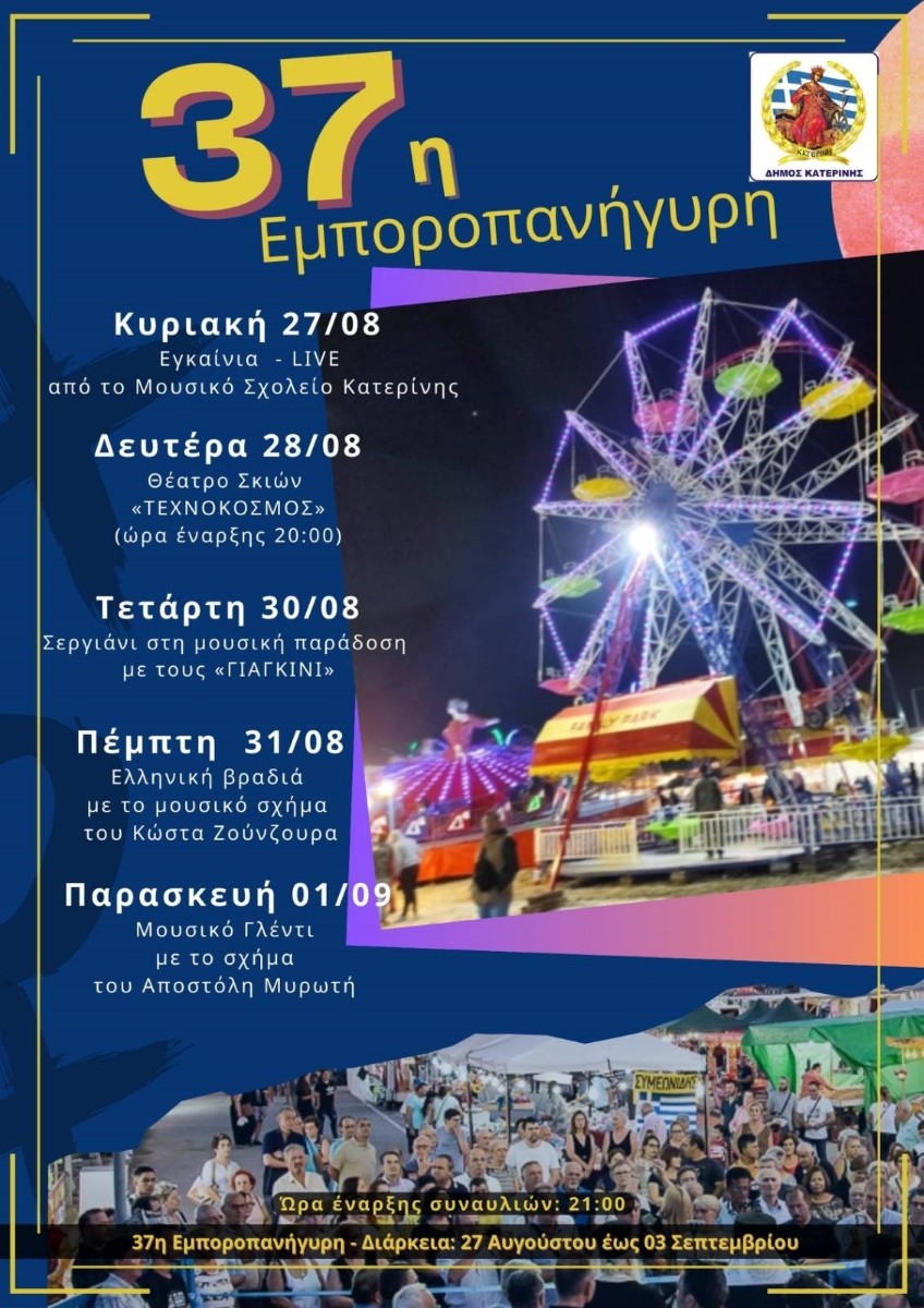 Η Εμποροπανήγυρη του Δήμου Κατερίνης αναμένεται το χρονικό διάστημα 27 Αυγούστου έως 03 Σεπτεμβρίου 2023, να φιλοξενήσει δεκάδες εμπόρους, μικροπωλητές κ.α. εκθέτες, ενώ οι τοπικοί και όχι μόνο παραγωγοί, θα έχουν τη δυνατότητα προβολής και ανάδειξης των προϊόντων τους.