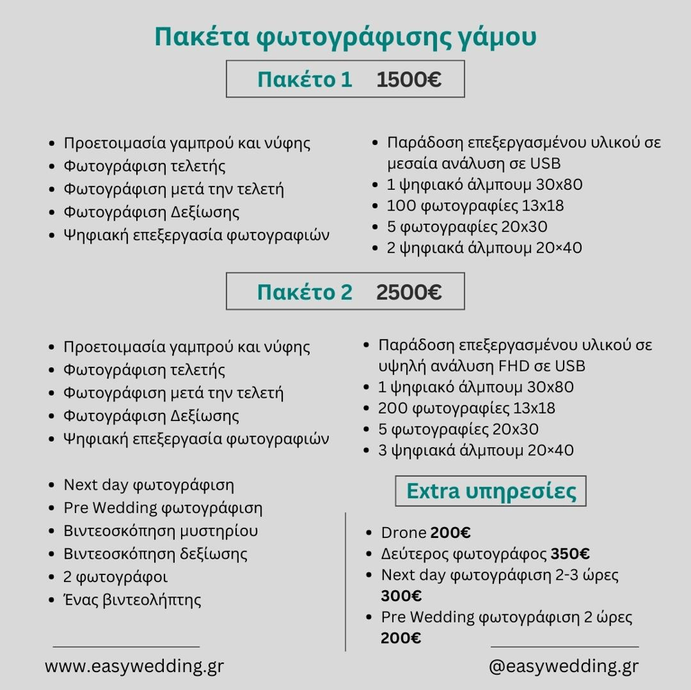 - Έξτρα υπηρεσίες: Εξατομικευμένες υπηρεσίες όπως βίντεο, drone shots, άλμπουμ πολυτελείας, μπορούν να αυξήσουν το κόστος μεταξύ 2.500-3.500 ευρώ ή περισσότερο.