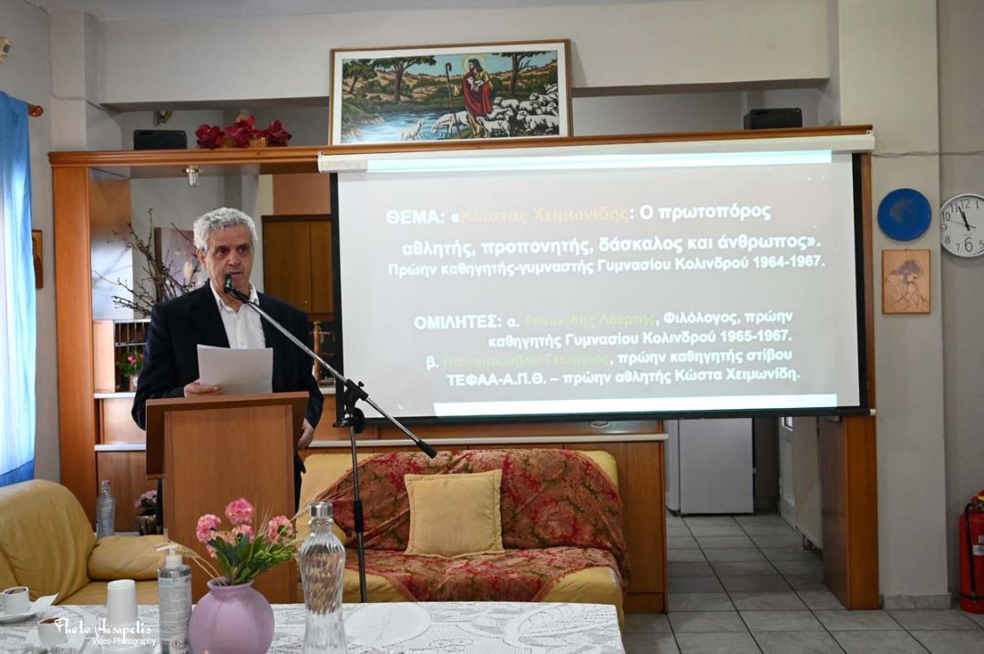 Η Ομάδα Επιστημόνων Κολινδρού, σε συνεργασία με τον Δήμο Πύδνας_Κολινδρού (ΔΗΦΟΠΑΠ) και τον Όμιλο Αθλητών και Φίλων Κώστα Χειμωνίδη, διοργάνωσε εκδήλωση προς τιμήν του πρωτοπόρου αθλητή, προπονητή, δάσκαλου και ανθρώπου που υπηρέτησε την περίοδο 1964-1967 ως καθηγητής-γυμναστής στο Γυμνάσιο Κολινδρού.