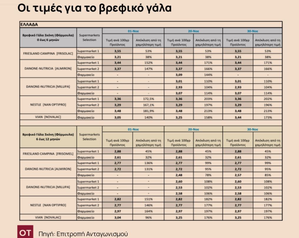 Σύμφωνα με έρευνα σύγκρισης τιμών που διενήργησε η Επιτροπή Ανταγωνισμού τον περασμένο Νοέμβριο, για τα γάλατα για βρέφη έως 6 μηνών οι τιμές στην Ελλάδα είναι από 144% έως 171% πάνω από τη χαμηλότερη τιμή που εντοπίζεται στο Βέλγιο και την Ολλανδία.