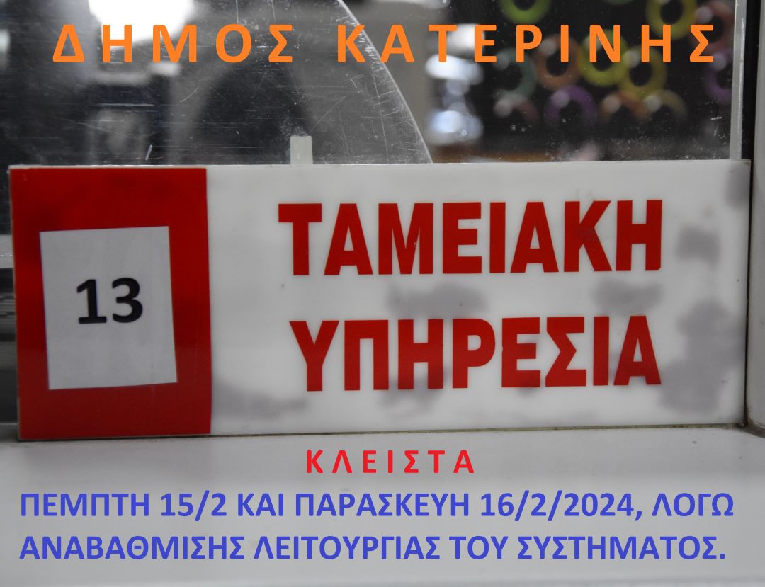 Η Αντιδημαρχία Οικονομικών Δ.Κατερίνης ανακοινώνει ότι την Πέμπτη 15/2 και την Παρασκευή 16/2/2024, θα είναι ΚΛΕΙΣΤΗ η Ταμειακή Υπηρεσία του Δήμου, λόγω σοβαρού τεχνικού προβλήματος.