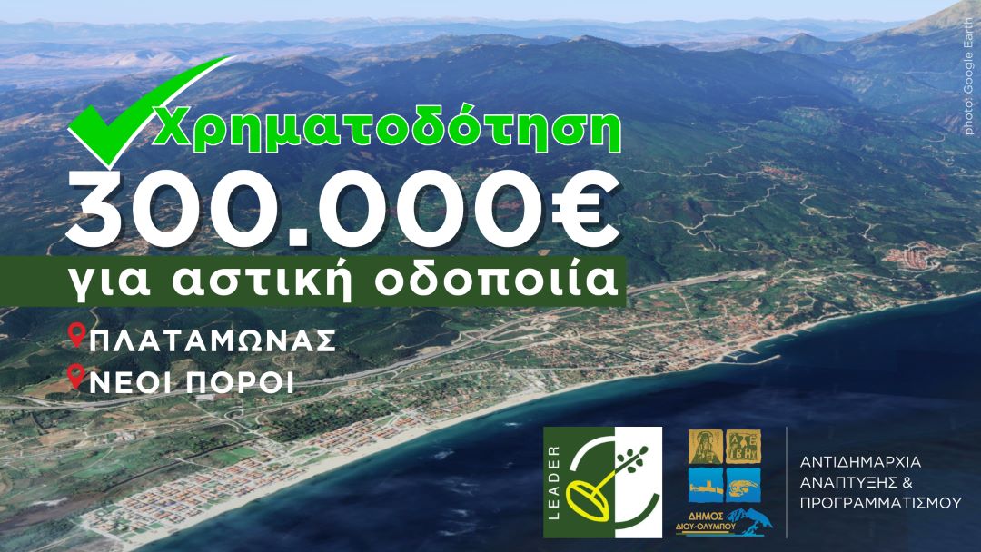 Με το ποσό των 300.000 ευρώ (με ΦΠΑ) χρηματοδοτήθηκε ο Δήμος Δίου-Ολύμπου από το Πρόγραμμα Leader, μέσω της Περιφέρειας Κεντρικής Μακεδονίας, μετά από πρόσκληση της Πιερικής Αναπτυξιακής, για την βελτίωση υφιστάμενων δρόμων στις δημοτικές κοινότητες Πλαταμώνα και Πόρων.