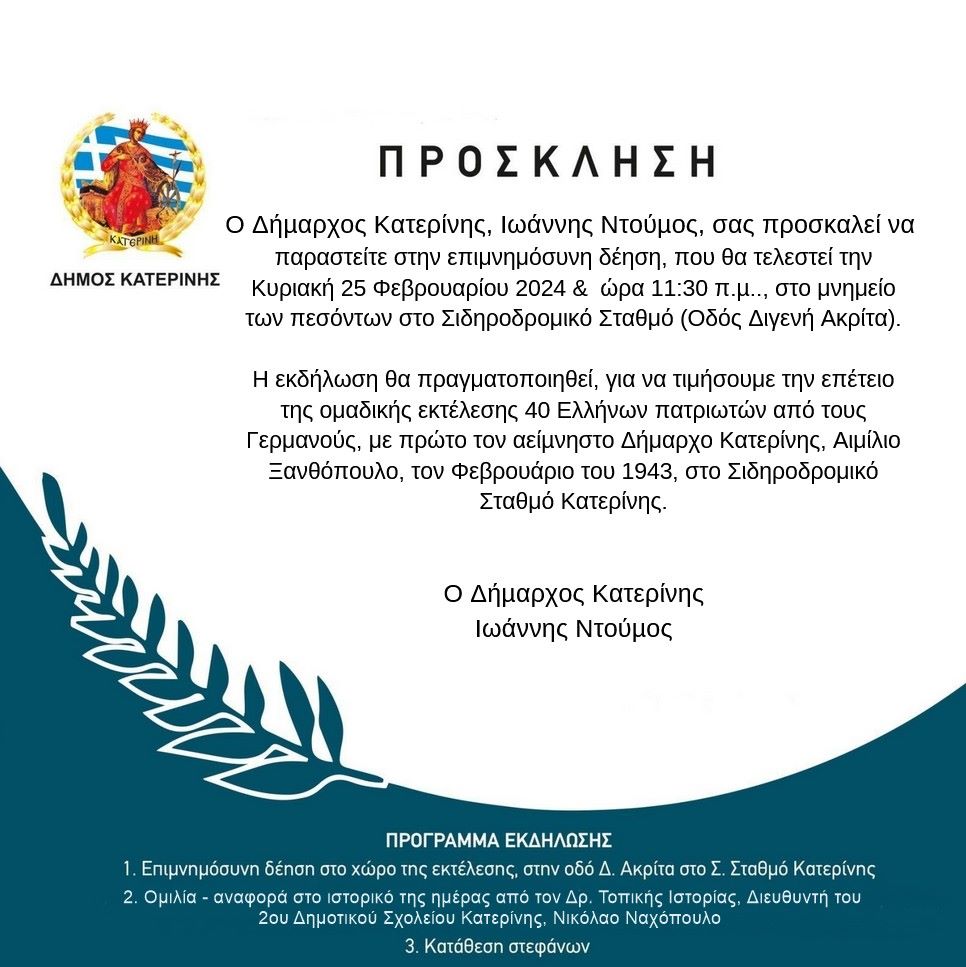 Την Κυριακή 25 Φεβρουαρίου 2024 στις 11:30 π.μ. στον Σιδ. Σταθμό (οδός Διγενή Ακρίτα), θα πραγματοποιηθεί από το Δήμο Κατερίνης η τελετή μνήμης και τιμής των Θυμάτων Κατοχής.