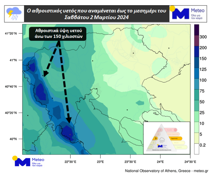 Μεταβολή του καιρού αναμένεται από απόγευμα της Πέμπτης 29/02 έως το Σάββατο 02/03. Ισχυρές κατά τόπους βροχές με σημαντικά αθροιστικά ύψη υετού θα εκδηλωθούν στη Μακεδονία και ιδιαίτερα στα δυτικά τμήματα της Κεντρικής Μακεδονίας. Όπως φαίνεται στον σχετικό χάρτη, στους νομούς Πέλλας, Ημαθίας και Πιερίας ο αθροιστικός υετός προβλέπεται να ξεπεράσει κατά τόπους τα 150 χιλιοστά.