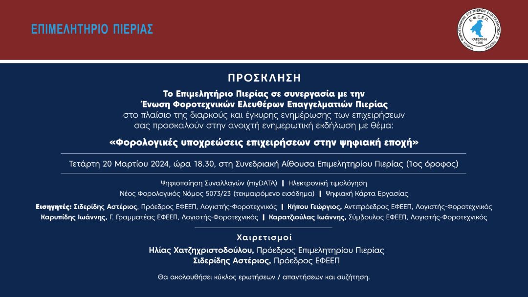 Το Επιμελητήριο Πιερίας και η Ένωση Φοροτεχνικών Ελευθέρων Επαγγελματιών Πιερίας (ΕΦΕΕΠ), σας προσκαλούν σε ανοιχτή ενημερωτική εκδήλωση με θέμα: «Φορολογικές υποχρεώσεις επιχειρήσεων στην ψηφιακή εποχή», την Τετάρτη 20 Μαρτίου και ώρα 18:30, στη Συνεδριακή Αίθουσα του Επιμελητηρίου Πιερίας (1ος όροφος).