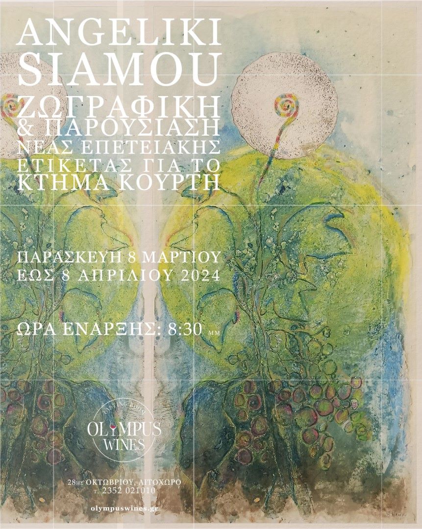 Έως τις 8 Απριλίου 2024, στο Λιτόχωρο, στο Olympus Wines tasting room, χώρο οινογνωσίας και wine bar, συνεχίζεται η παρουσίαση της νέας επετειακής ετικέτας για το Κτήμα Κούρτη καθώς επίσης και η έκθεση εικαστικών έργων της γνωστής καλλιτέχνιδος, Αγγελικής Σιάμου. angelikisiamou.gr